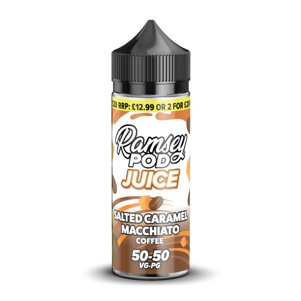 Salted Caramel Macchiato from Ramsey Pod Juice. A double concentrated salted caramel macchiato coffee eiquid for vapers who like strong flavours in big bottles.